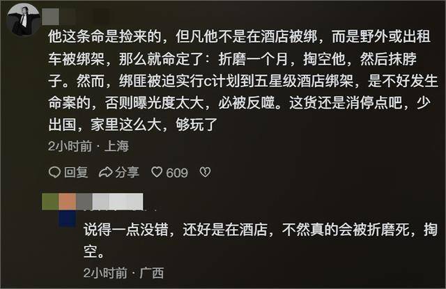 有网友评论道:他这条命是捡来的,但凡不是正在酒店被绑,而是正在野外或出租车上,成果可能就是被一个月,掏空后。